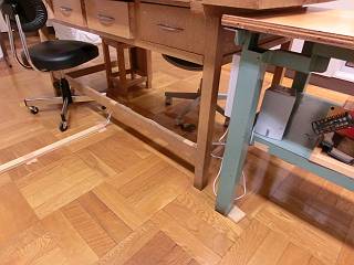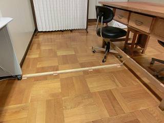 2つ並べた机の端にモールをおいて、真ん中の机へ。