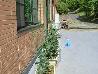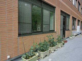 昨年度は畑で支柱を立ててネットをつけたが、今年はプランター+ネットのみ。