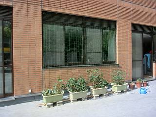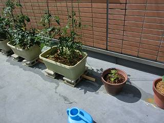 部屋の前のベランダに置いた野菜が伸びてきたので、ネットを取り付けてみた。