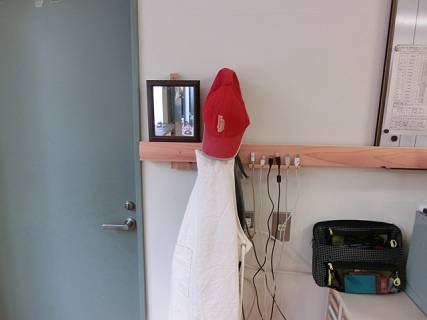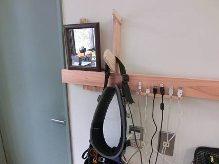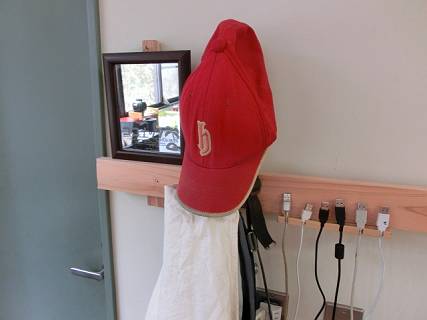 柱の部分は左側に鏡をつけるためのフック。右側は作業時の工具入れと帽子を掛ける場所にした。
