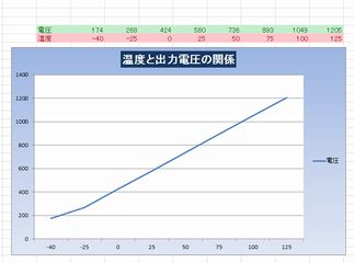 −40°C〜125°Cまでを計測できるのと、ほぼ出力がリニアに出るのでAD変換後にココナッツで処理するのが簡単かなと考えた。