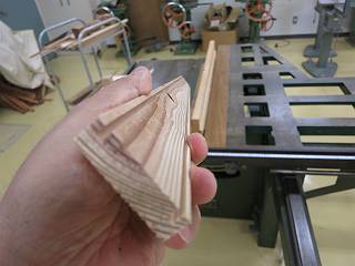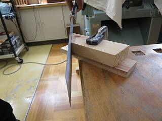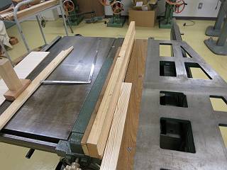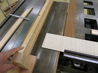 両側に溝を入れたら、縦びきして高さをそろえる。一枚の両こばから20mmで切断した。