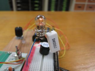 豆電球は2.5V用なので、そのまま5Vにつなげば明るいけれどすぐに切れてしまうだろうから、セメント抵抗を直接つけて使うことにした。