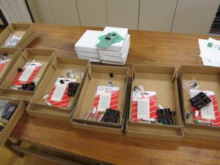 今回の受講者は7名なので、材料を箱に入れてセットし始める。右側の写真はブレッドボードの中身。