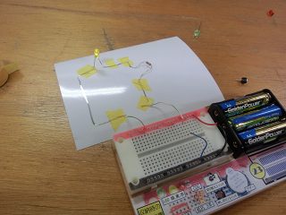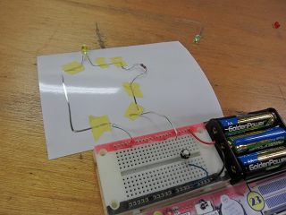部品をつなげば回路ができます。テープで貼るので,接続が分かるのならばブレッドボードの方が簡単。