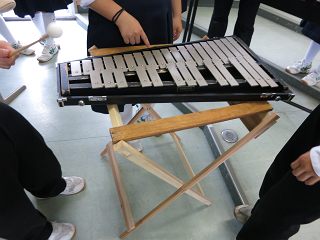 もう一つはグロッケン、いわゆる鉄琴。現在は生徒用の机に毛布を置いて高さあわせをした上で使っている。