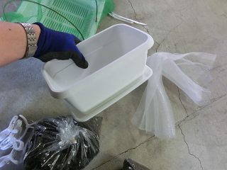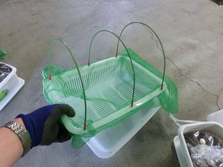 100円ショップの水切りかごにタマネギネットをかぶせ、針金で柱を作る。(すべてやっていただいてあった)