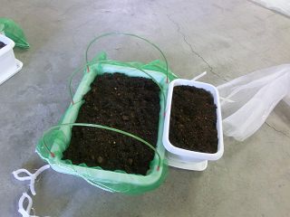 種を巻き終わったところ。左側の大きな鉢が「べが菜」を2列で播いたもの。