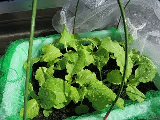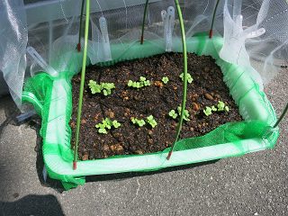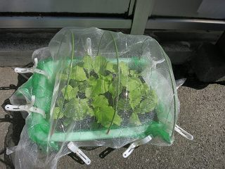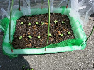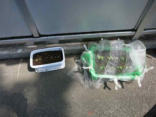 7月31日に播種をして5日ほどで双葉が出た。網をかけることで虫が付かないので無農薬栽培ができる。