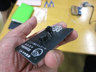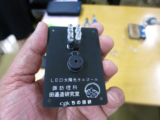 次に作ったのは、LEDを発電デバイスとしたオルゴール。4個の高輝度白色LEDとコンデンサにより、太陽光が当たるとオルゴールICが圧電ブザーを駆動して音が鳴る。