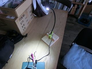 USB電源につなぐとこんな感じ。台座は木で作ってみた。