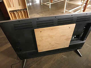 まずは、背面の固定用ねじ穴に合わせて合板を切って取り付けてみる。