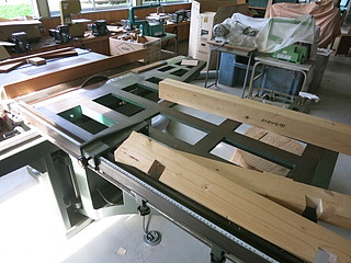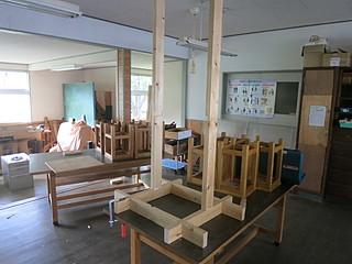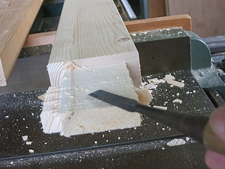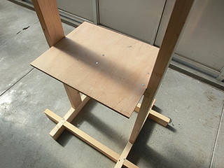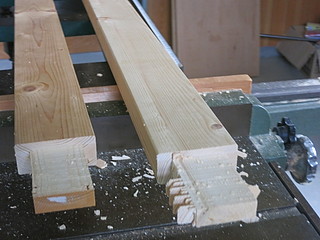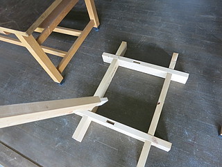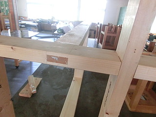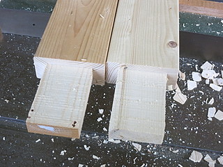 足は相欠きで井桁に組んで、そこに柱を差し込む。ぎりぎりで作ったので、かなりハンマーを振るってたたき込むことになった。