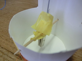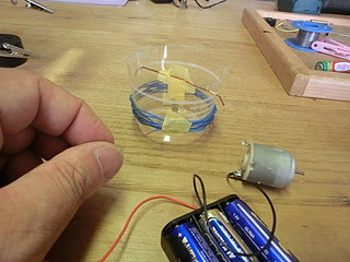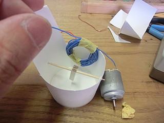 今度は直列につないでモーターを回すとメーターが振れる。ちなみに指針はお弁当の蓋を切って作った。