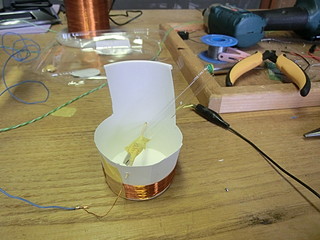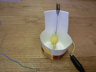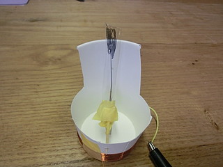 まずは、プラスチックコップに検針をつけてコイルを巻いてみることにする。