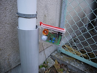 取っ手を雨水管のパイプに引っかけるようにした。
