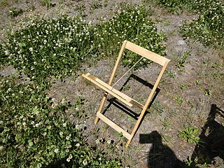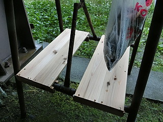 いえではこんな形にさびた脚立のに渡して使っていたが、中途半端に開くことになるのでストッパーを作った。