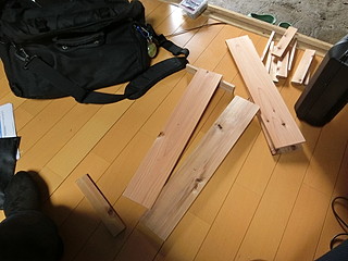 スギ板にストッパーのエンドをつけて下の段に渡す。