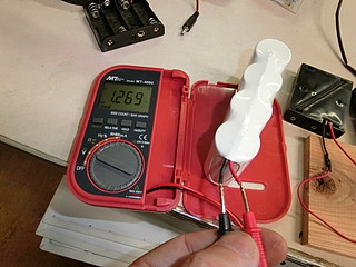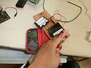 4個直列状態を作ることにした。買ったばかりのエネループは充電されているので、解放時には5.327Vだった。
