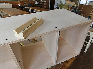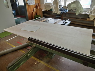 横切り盤の丸ノコ刃を古いもの(合板専用に使うようにした物)に取り替えて、大きさを合わせて切る。