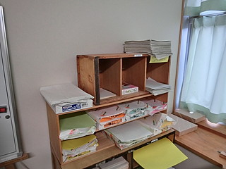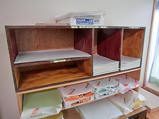 一つは印刷室の紙置き場、今までは左のようになっていたが大きさをそろえて入れられるように棚を作った。