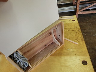 残っていたスギ板で箱を作る。今回は電源ケーブルとリモコンも入れることができるように内部を3つのブロックに分けた。
