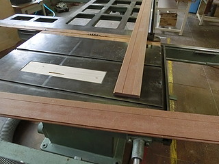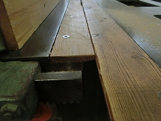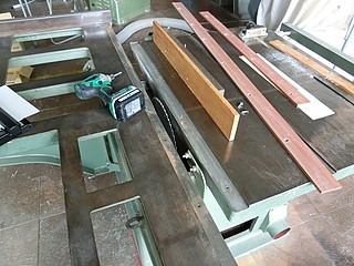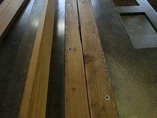 定盤端の木材、長年の使用で傷んでいるのと、テーブルの縁との段差が気になっていた。 校舎改築に来ていただいている業者さんから、床用の木材を頂くことができたので加工する。