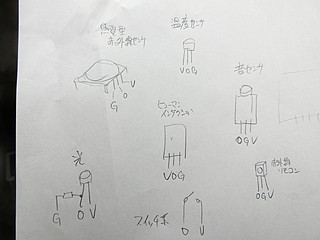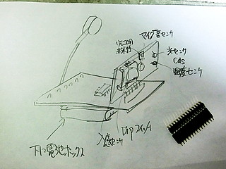 今まで赤外線リモコンの受光のみで使っていたAD変換ポートをいろいろなセンサに利用出来るようにした。(もう一つのAD変換ポートは光センサで固定)この基板で、赤外線入力、温度センサ、ドップラーセンサ(人センサ)、焦電型赤外線センサ、音センサ等々を利用することができる。