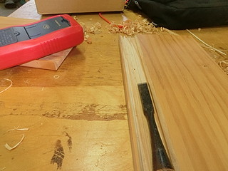 持ち帰られなかった生徒作品を分解して余った木材に溝を入れて始める。