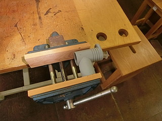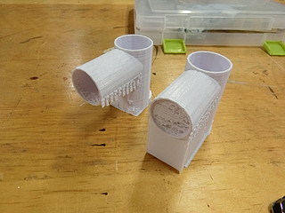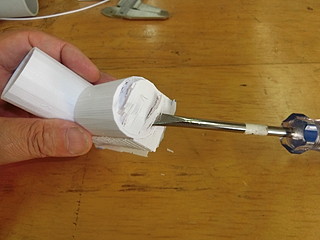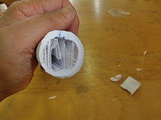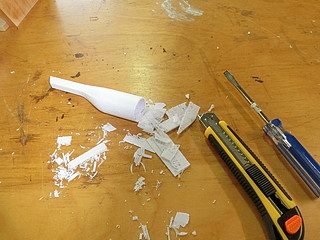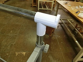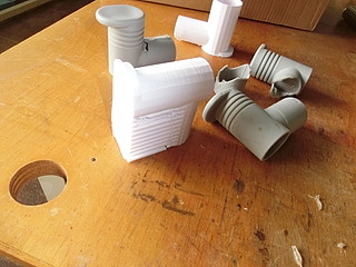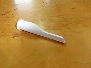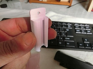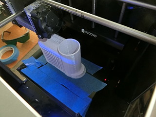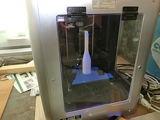 夏休み中に3Dプリンタを使いこなせるように練習していくつか作ってみた。 プリンタ自体よりも3DCADの操作法がメインだったが、youtubeにいくつも動画があったので、便利に研修させていただいた。 いくつか試したが、自分には「DesignSpark Mechanical」という無料のソフトが一番使いやすかった。 掃除機の吸い込み口を出力。縦方向には長く作ることができる。丸い口と四角い口、2つの面を描いてから「両者をブレンド」することで自動で描画してくれるのは秀逸。 220°に加熱して溶かしたプラスチックで出力していくのでサポート部材が必要になるけれど、これは本体附属のスライサーソフトが自動でやってくれる。 内部のサポート材をきれいに取り外すのはなかなか時間がかかるが、差込部分のテーパについても、設計すればその通りにできあがってくれるのでありがたい。 次はLED懐中電灯のホルダで練習。クリップ部分を差し込んで保持するように作った。 これくらいの大きさの物だと、設計に10分、出力に1時間半くらいで製作出来る。 これは自分の部屋の入り口に取り付けて使っている。 そして、材料置き台のパイプジョイント部。根元が折れてしまったけれど、ポリプロピレンなので接着剤ではつかなかったので作ってみた。 パイプの内径、外径を指定すればその通りできあがる。もちろん、位置を間違えて設計すればその通りに出力(T_T) こちらも内部のサポート材の除去が大変。90°に交差しているので,横方向に伸びる部分には必要になる。 相手がステンレスパイプなので、サポート材が入る側のパイプは内径を1mm(周囲に0.5mm)大きくすることでサポート材が完全除去できないことに対応した。 経年変化もあったか、3カ所壊れていたが同じ設計なので、待てばできあがるのはありがたい。これは1つあたり出力に4時間半かかった。 最後はシン・ココナッツの筐体。こちらも出力には4時間くらいかかるので、とても生徒用にと言うわけにはいかないかな。(本校では1学年が10人くらいなので、まあなんとかなるけれど) プリンタは自分が異動してくる前に、前の先生が購入してあったもの。平成30年度購入、「安心の日本製」とのことだがすでに会社は存在していなかった。しかし、さすがに物自体はしっかりできている。実用的にも使えることがわかったので、これからいろいろ作っていきたい。