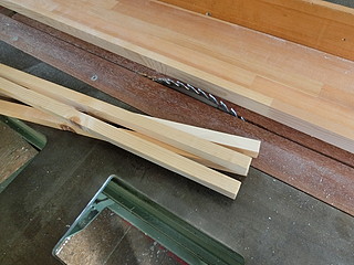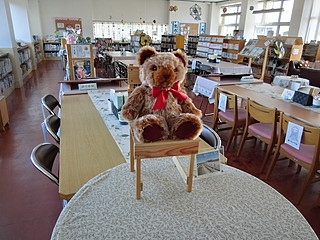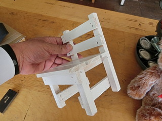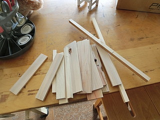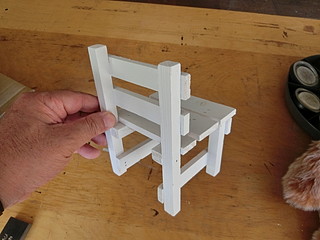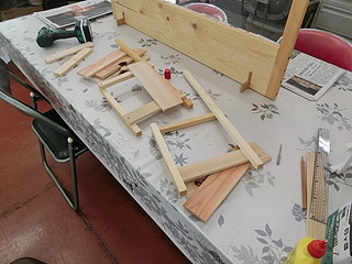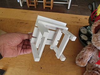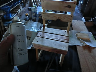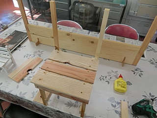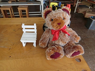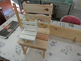 図書館の司書さんより、保護者が寄付してくれたくまを座らせておく椅子を作るよう依頼された。 文化祭のPTA展のためにつくったものを頂いたとのこと。 こんな椅子のイメージで、大きさに合った物にしてほしいと。 作り自体は強度を意識することなく、形があれば良いという小学生の工作レベルなので同じように作ることにした。 それでも多少の材料は使うけれど,ストックの木材を削ったり分割したりして細く薄く材料を加工する。 30分ほどで加工して、組み立ては職員室で合間を見ながら行った。 木工ボンドとコーススレッドのみだが、数百グラムのくまが載るだけなので、問題はなさそう。 塗装もスプレーで簡単にして、図書館で生徒を迎えることになった。