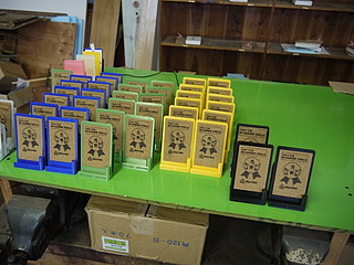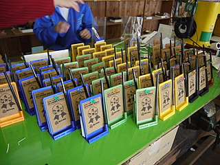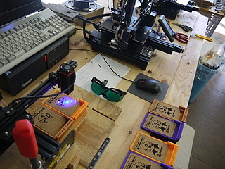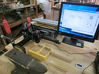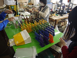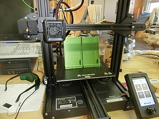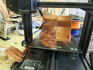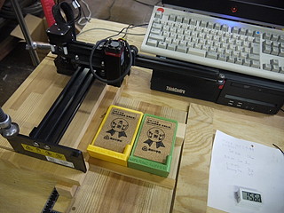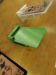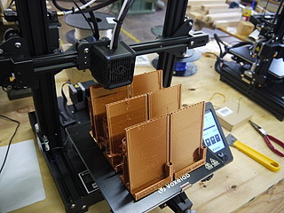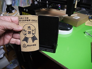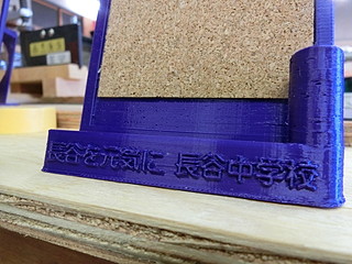 今年度、自分の中学校が博報賞を受賞して、副賞としてお金も頂いたので記念品を製作して配付することにした。 数は100個を少し上回る程度なので、3Dプリンタとレーザー加工機で製作することにした。 物はメモスタンドで、書いたメモを磁石で貼り付けておくようになっている。一から設計してみた。 3Dプリンタで1つ作るのに7.5時間くらいかかるので、教育事務所からプリンタを借りてきて作ろうとした。 しかし、 1:ヒートベッドではなく両面テープを毎回貼らなくてはならないこと。 2:大きさの関係から一度に1つしか作れないこと。 3:フィラメントがチップで管理されていて、高い純正品しか使えないこと。 などから、結局1つ作ったくらいでお返しした。 結局、個人的にも一台購入して2台同時に稼働させて量産することに落ち着いた。 レーザ加工はコルクシートを貼ってから図案を焼き付ける。コルクなのでレーザ出力や加工時間を抑えることができる。 各色のフィラメントを購入して量産、1kgで20個ほどできる計算だが、結構失敗があって時間とフィラメントを無駄にしてしまった。 この3Dプリンタは220×220の作業領域があるので、それに合わせて設計して最大6個を作ることができるようにしたが、 時間は数に比例していて6個だと45時間かかるのと、冷えすぎるのかヘッドを動かしすぎるのか、失敗も多くなった。 結局、昼間に1つ、夜中に2つの一日あたり3個製作パターンが一番無駄がなかった。3つ以上は歩留まりが悪すぎる。 袋詰めなどはほかの先生方にも手伝って頂いて、感謝の会の際に地元の方々へ60個ほどお配りすることができた。 現在生徒分の配付が終わり、年末年始休み中は職員の分を量産している。 サポート材の付け方や、量産の際のノウハウなど多くの知見が得られたのでこれからにいかしていくことができそう。