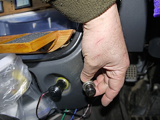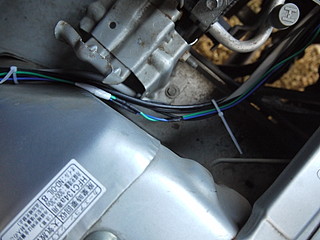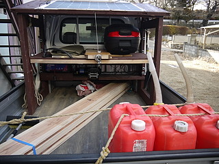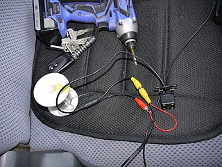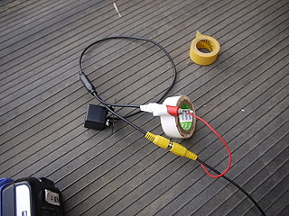 軽トラにはドライブレコーダーも兼ねて、電子バックミラーをつけてあるのだけれど、そのカメラは後ろのナンバープレートの上にあるので、荷台の様子が死角になってしまう。 走っていると荷台に積んだ荷物が崩れていないか心配になるので、荷台の監視用カメラを設置した。 カーステレオは以前取り付けた安い物だけれど、バックカメラも附属していた。電子バックミラーがあるので取り付けてなかったカメラを使うことにした。 カーステレオの裏側にカメラを取り付ける端子があるので分解する。 本来はバックギアに入った際にカメラがアクティブになるのだけれど、今回は任意の時に使いたいので、バックギア信号(バックランプの電源)を接続する線に、直接12Vを入力する。スイッチ付きのシガレット電源を使って取り出すことにした。 12Vを室内側から逆に流してカメラの電源に使うように接続。チェックするとスイッチオンで映像が切り替わることが確認出来た。 ケーブルはシート下のエンジンルーム経由で荷台に引き回す。 黄色のコネクタが映像信号、もう一つが電源+映像の切り替え用信号ケーブルになる。 カメラはとりあえず荷台の上に取り付けることにした。今後は磁石で任意の位置に取り付けられるようにしたい。 走っているときにも、振り返ることなく荷台の様子を見ることができるようになった。