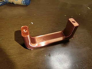 長いことタンスの取っ手が壊れたままだったので、3Dプリンタで出力して修理した。 取っ手のパーツを買ってくる手もあったが、幅があっているかどうかわからなかったし3Dプリンタで作成した方が早いので現物あわせで設計した。 値段的にもビスナットを買うだけなので財布に優しい。フィラメント代はまあ数十円と言うところでしょう。 スライサソフトの画面と出力した部品。出力には2時間弱。設計は15分くらいかな。 今回はビス穴を隠さずに開けたままで設計してしまった。サポート材を取り除いてビスを入れる。結局ワッシャは穴に会わなくて外した。 取り付けた様子。失敗無く一発で完成した。 このタンスは自分の父が結婚したときに買った物なので、もう60年以上前のもの。 元々付いていた取っ手よりもしっかりした物ができた。