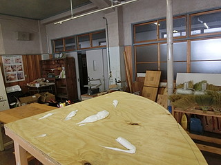 天板は一度構造合板を糸鋸で形を作ってから貼り付けた。