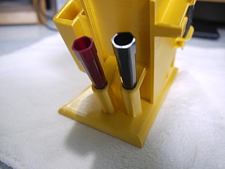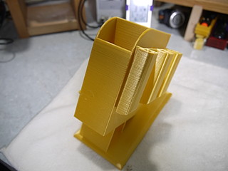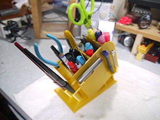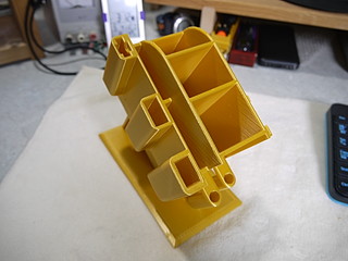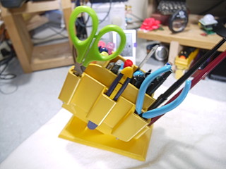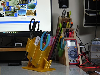 書類を決裁するのに職員室で行うことも多いので、職員室用のペン立てを3Dプリンタで製作した。 以前木材で作った家のペン立ての横に取り付けたツールホルダを元にペン立ても設計。 出力には34時間くらいかかった。ほぼプリンタの限界に近いフットプリントだったが、一回で成功して良かった。 左側にはさみとカッターとラジオペンチ、右側には決済用の印鑑の一時置き場所をつけた。精密ドライバもたまに需要があるのでセットした。 ほぼこれが欲しくて製作することにした万年筆スタンド部分。ペンだけ立てても大丈夫かと思ったが、密閉性を考えて元からついていたキャップをボンドで固定。 使ってみたらペン立て部分が深すぎたので木材を入れて上げ底にした。 家のペン立てとの比較、家のペン立てはテスターと遠隔配信用のマイクが取り付けてある。 職員室に置いたところ、あまり職員室にはいないので、先生方に使ってもらうことも想定している。