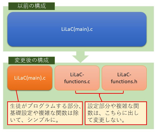 今回娘が結婚した旦那さんがエンジニアだったこともあって助言を受けることができたので、プログラムを「生徒が自分で構成する簡単な部分」だけを取り出してソースコードを書けるようにして、それ以外の部分は別ファイルで見えないようにするよう変更した。