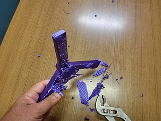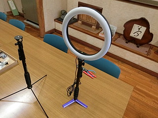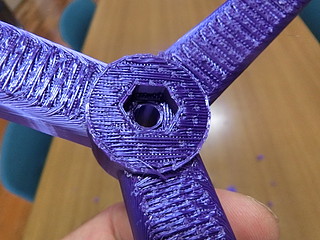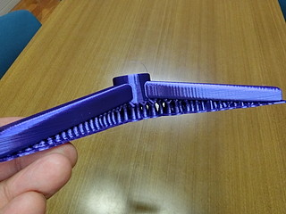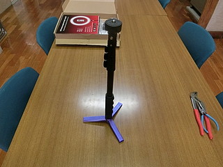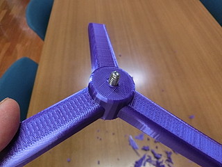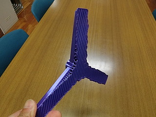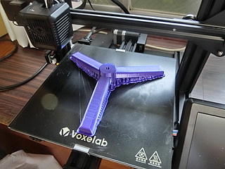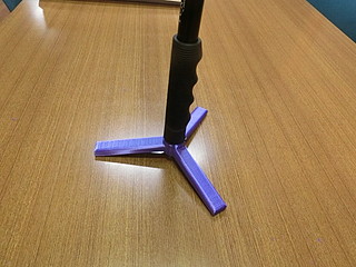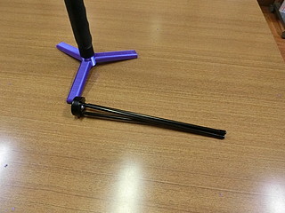 映像配信の際に利用するLEDリングライト、今回授業を遠隔配信する際に、友人から2台借りてきたのだけれど、片方の足が紛失されていた。 お礼も兼ねて、足を作ることにした。(さすがに当日には間に合わなくて、手持ちの三脚で対応した) 120°で三方向に伸ばした状態で設計、やはり3本足が一番便利だと思われる。 地面の凹凸に対応出来るように接地部分は先端だけにした。さすがにこの角度だとサポート剤が必要。 三脚ネジを使うので、裏側からボルトを差し込む設計。0.3mmのゆとりを持たせたらちょうどくわえ込まれる形になった。 脚に取り付けた状態。脚は自撮り棒のように手で持つためのグリップがついている。 こちらは、もう一つの方の本来附属していた足。折りたためるようになっていて広い範囲に広がるが、まあこれで充分役割は果たせそう。 LEDライトを付けた状態。風などが吹かなければ大丈夫。ちなみに三脚ネジはインチねじの1/4が適合する。 この足で購入時の箱にも収まったので、返すときには喜んでもらえて良かった。