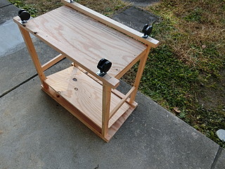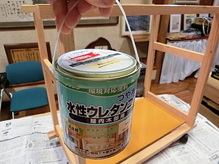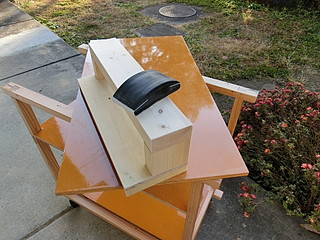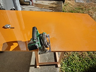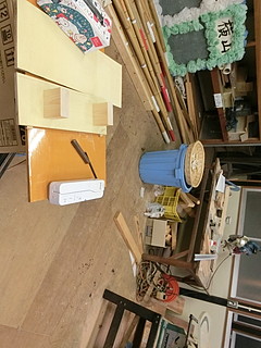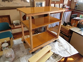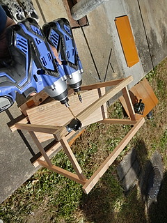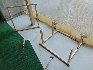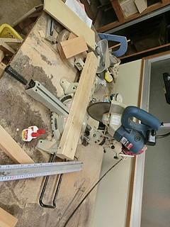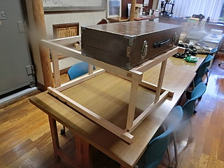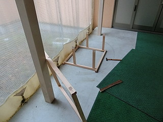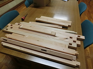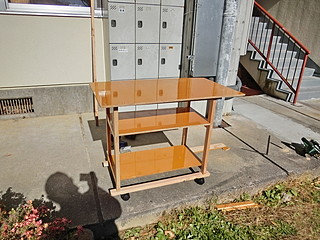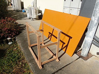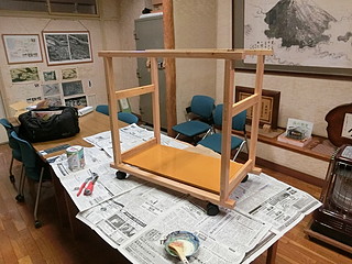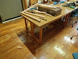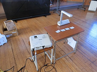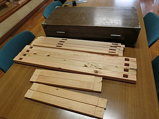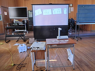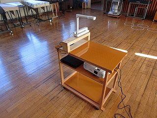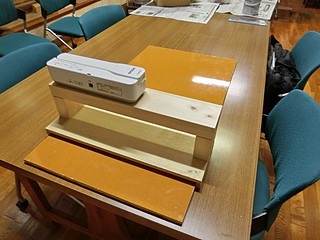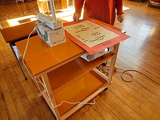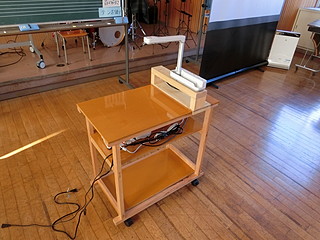 今年度予算で、音楽室にプロジェクターとスクリーン、実物投影機が導入された。学校ではICT機器の導入が進んでいるが、あまり利用が進んでいないところでは、とりあえず大きく映すところからスタートしてなじんでもらうのが良い感じ。 こんな感じですぐに使えるようにするのが良いと感じたので、テーブルを製作することにした。 自分の学校には以前の森の教室を壊した時にでた古い材木が豊富にあるので、近くの学校で製材して角のみ盤でほぞ穴を開けてきた。 校長室でホゾを調整して、渡り廊下で組み立てる。 木工ボンドで固定して一晩乾燥させる。 天板と棚板は塗装合板を貼り付けることにした。 下穴用と締め付け用の2台のインパクトドライバで楽に組み立てる。 試用して使用感を確認する。A3のプリントを写せるよう実物投影機は少し高さを持たせることにした。 本体は透明の水性ウレタン塗料で塗装。天板の周りも切っただけで塗装したのみ。 余りの材で実物投影機の台を製作。小学校にもスライド丸ノコがあるのでありがたい。 テーブルの幅一杯で引っかかる構造にして台とした。 中間がプロジェクター用のテーブル、一番下にも棚を付けた。足はロック付きキャスター。 こんな形で収めることにした。実物投影機からプロジェクターにはUSBで入力されるので、アナログ入力でDVDを接続。HDMIはパソコン用に残しておいた。授業がより楽しいものになってくれるとよいな。