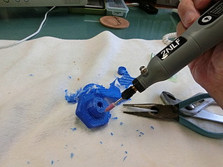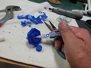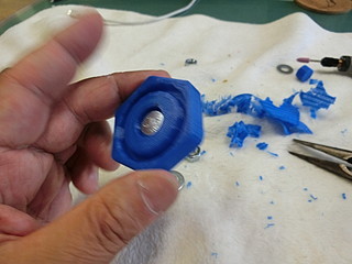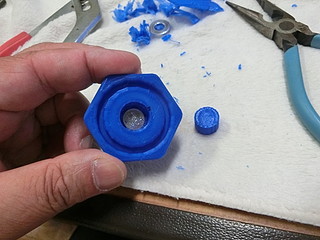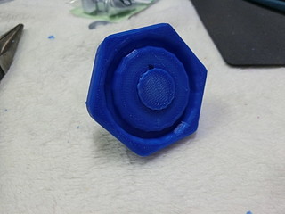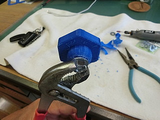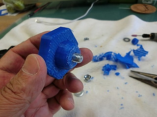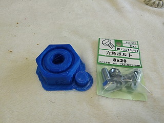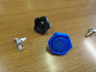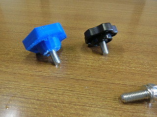 学校の作業時に使う荷車。先日の作業の際に止めねじがどこかに行ってしまった。 この黒いネジが無くなったので、ネジを買ってノブを3Dプリンタで出力することにした。 ネジは一般的なM8だった。ノブに埋める部分も考えて5mm長いものにした。 元は五角形だったが,手っ取り早く六角形でデザインして少しリブなど付けた。 内部に埋め込むために、ナットを付けてネジを締める。 蓋の部分は、瞬間接着剤を付けて押し込んだ。 今回、蝶ねじも無くなったので、一緒に買ってきた。これで部品製作完了。 色違いになってしまったが、無事に使えるようになった。