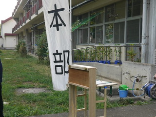机を広げて旗を立てたところ。引き渡し用の名簿チェックなど、机を使うことになる。