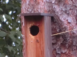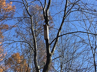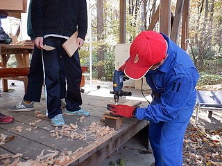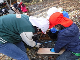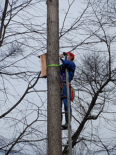 アカマツ枯れを防ぐために子どもたちがやってみることに決めたアカゲラを呼ぶ作戦。 マツノザイセンチュウを振りまくマツノマダラカミキリの幼虫を食べてもらうためにお宿を作る。 材料はたくさんあったので、6つの縦割り班で2つずつ、計12の巣箱を作ることにした。 材料は中学校の木工室をお借りして長さに切ってきた。子どもたちは表面のかんながけと穴あけ、組み立てを行った。 登山用のハーネスなどをお借りして、コーディネータの先生と二人で取り付ける。 表面に貼った木の皮をつついて穴を開け、アオゲラやアカゲラがやってきました。