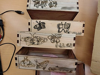 小学生がつくる蝶の標本箱に図工で描いた絵を彫刻した。 この蝶の標本箱はサンプル。これを参考にレーザ加工機で標本箱も部品作りをした。 子どもが描いた絵をスキャンした後、輪郭線を読み出してレーザで加工した。