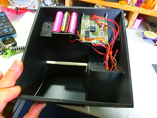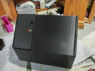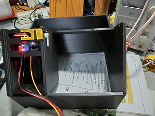 ゴミ箱自体は3Dプリンタで造形して、蓋部分をセンサーによって手を検出して自動開閉するようにした。サーボモータの附属ホーンで直接駆動する形にした。