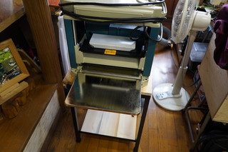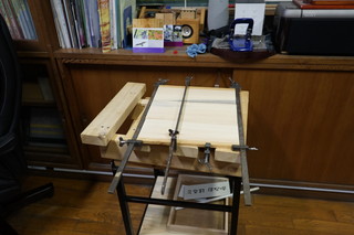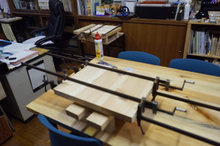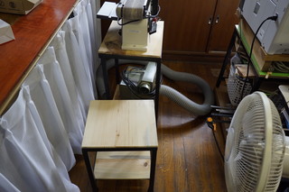 鉄骨材とアカマツ枯れの木材を使って、さまざまなテーブルを製作している。 乾燥製材した材料はテーブルの大きさに合わせて接着して天板にする。 足は以前から購入してストックしてある角材を溶接して作成、3Dプリンタで作った足キャップをはめる。 今年の補助金で購入した自動カンナ盤と、ベルトサンダーは専用のテーブルにした。今まで中学の木工室を借りていたのが、小学校で作業できるようになった。 その他は、汎用の作業台と上伊那教育会館のプロジェクターテーブル。いままで椅子を台にしていたが専用品にできた。