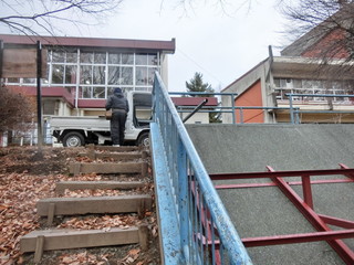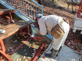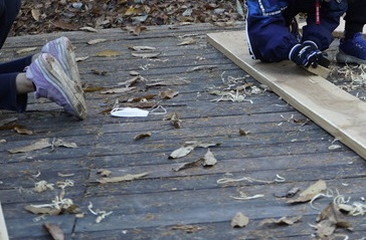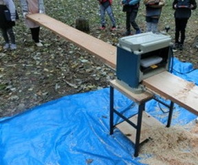 鉄骨を組んでいただいた後、6年生の作業で座板を張っている。 自動カンナ盤で板を削るがやはり重さと機械に合わせての動きをする必要性とで、2枚ほどやって後は先生たちで行った。 今年度購入した、マキタのランダムオービットサンダーで表面を削り、カンナで面取りをする。 ストックした材料を使ったので、補充のために今年度伐採した赤松を製材して納めてもらう。 公民館運営委員長さんには、さらに上下の階段部分を後から取り付けていただいた。 春までには製作を終えて、お披露目になる予定。