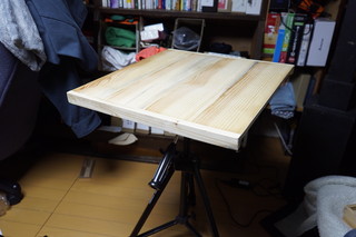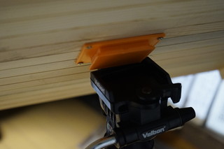 三脚は昔から使っているけれど、写真を撮るとき以外はほぼ出番が無い。 クイックリリースの形に3Dプリンタでアダプタを作って、テーブルにしてみた。 30年ほど前から使っているベル本のビデオ三脚 クイックリリースはカメラ側に付けるので、予備も持っている。 噛み込む部分の大きさを再現して3Dプリンタで作成した。 板の裏側にネジ止めしている。取り付けないときにも安定しておけるように、板の横には脚をつけている。 こんな形で使用する。中心だけで固定するので載せる物は選ばなければいけないが、高さも変えられるし不整地でもおけるので便利に使っている。